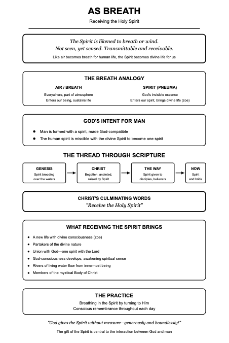 God is Spirit, and He desires to give His Spirit to humanity. His Spirit is His invisible essence. The Spirit is compared to the breath or the wind. It is unseen, yet it can be felt. Like the wind or breath, it has the unseen power to sustain and move what is seen. Breathing in the Spirit by turning to Him is essential for a life in Christ. We live both in the world and in Christ. Practicing conscious remembrance is a simple way to receive the Spirit's supply each day.