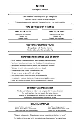 The teaching is clear: the mind set on the spirit is life and peace. Achieving this state is fundamentally about attention. While we commonly view the mind as the center of intellect and reasoning, Scripture reveals its primary function as an organ of attention—what we deliberately choose to attend to and bring to remembrance. This choice shapes our lives more than any other decision we make.